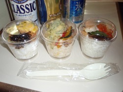 北斗星入線後、早速乗車。まずはロビーカーを目指す。ロビーカーにて夕食を食べる。 札幌駅で買った弁当を広げ、乾杯!