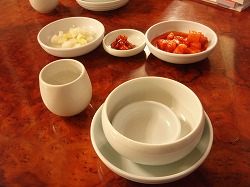 すぐにビールとキムチ等の小菜が置かれる。まずは乾杯!! ビール飲みながらサムゲタン