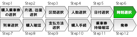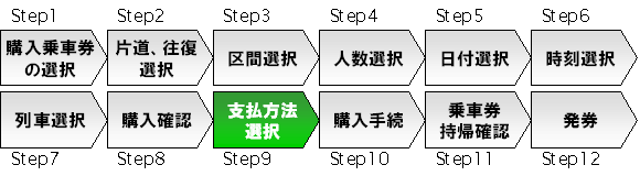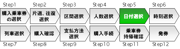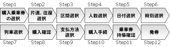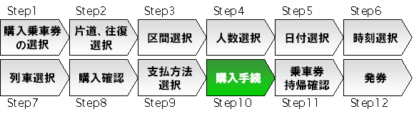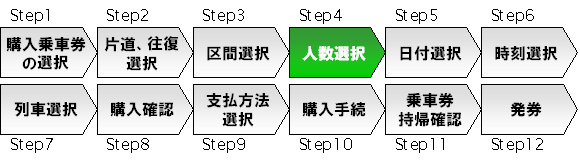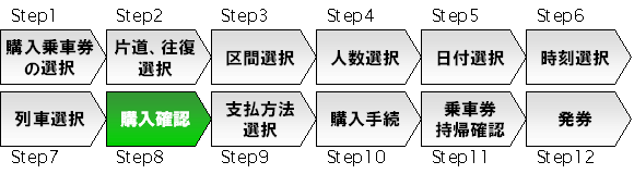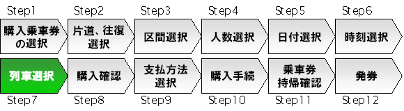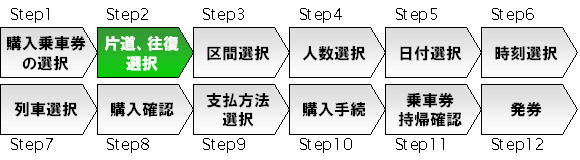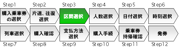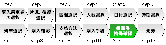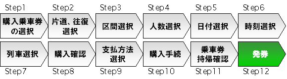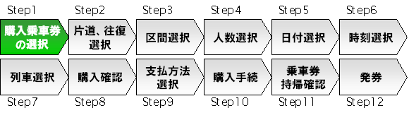 自動券売機での購入の流れは以下の通りです。購入完了まで12Stepの手続きを行ないます。 12Stepと言っても質問に答えるだけですので、難しくはなく、また、それ程時間も掛かりま せん。注意:往復乗車券購入の場合は行き、帰りと、列車選択を2回行ないます。