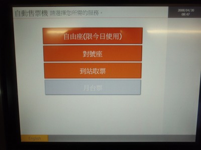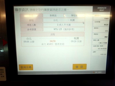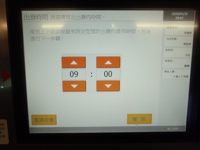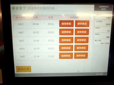 今回は9時過ぎの列車、0453列車、台北駅発9:06の普通車に乗ります。一番上の 0453列車の「標準車廂」を押します。