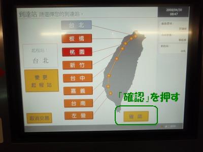 乗車駅は予め入力されている為、下車駅を選択します。今回は、台北から桃園までの乗車 券を購入する為、「桃園」を選択し、「確認」を押します。