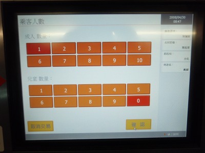 乗車人数を選択します。上段は「成人數量(大人数量)」、下段は「兒童數量(子供数量)」 です。