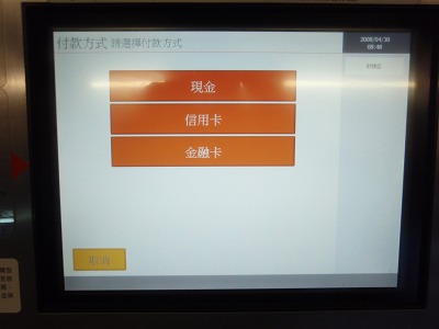支払方法の選択を行ないます。支払方法は自動券売機上に記載されている項目から選べま す。尚、一部の自動券売機は現金購入に対応していません。 購入前に自分が希望する支払方法に対応しているか確認しましょう。ここまで手続きが進ん で購入できないのは、あまりにも悲しいです。経験者は語る(笑)