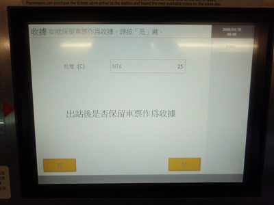 改札を出る際、乗車券が必要かどうかの選択画面。 乗車券を記念に持ち帰りたい方は「是」を選びましょう! |