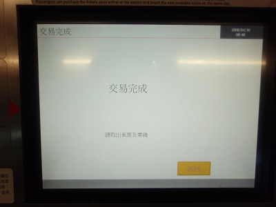 暫く待つと、画面が「交易完成(取引完了)」となり、下の取り出し口に切符、現金購入 の場合はおつりが出ます。
